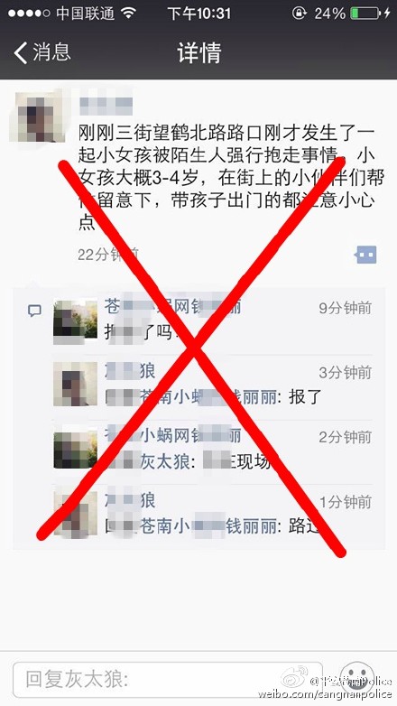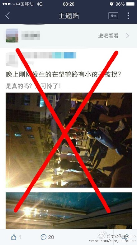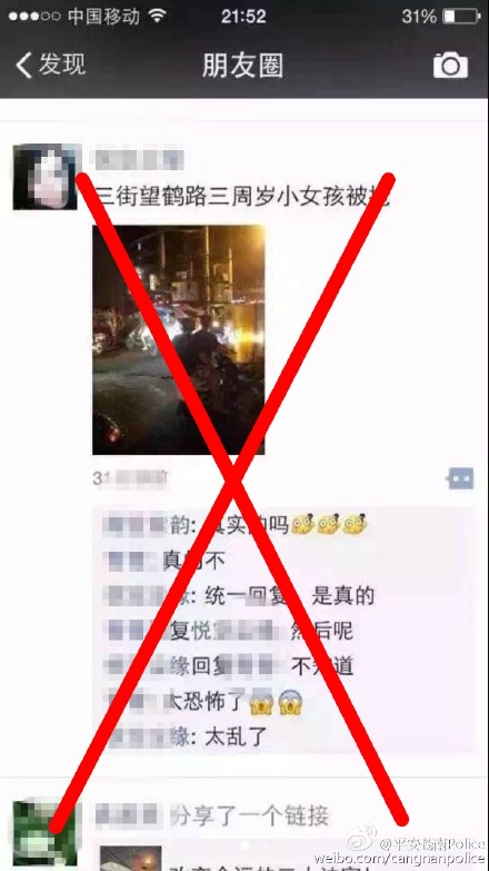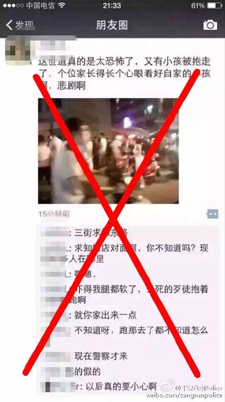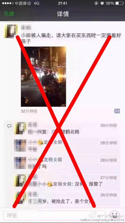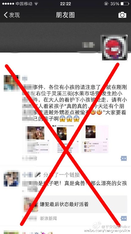 有网民在朋友圈热传灵溪镇发生“拐骗孩子”一事。12日中午,灵溪中心派出所官方微博“平安灵溪”发表辟谣文章,表示11日灵溪望鹤路发生的“拐孩子”一事纯属虚惊一场。