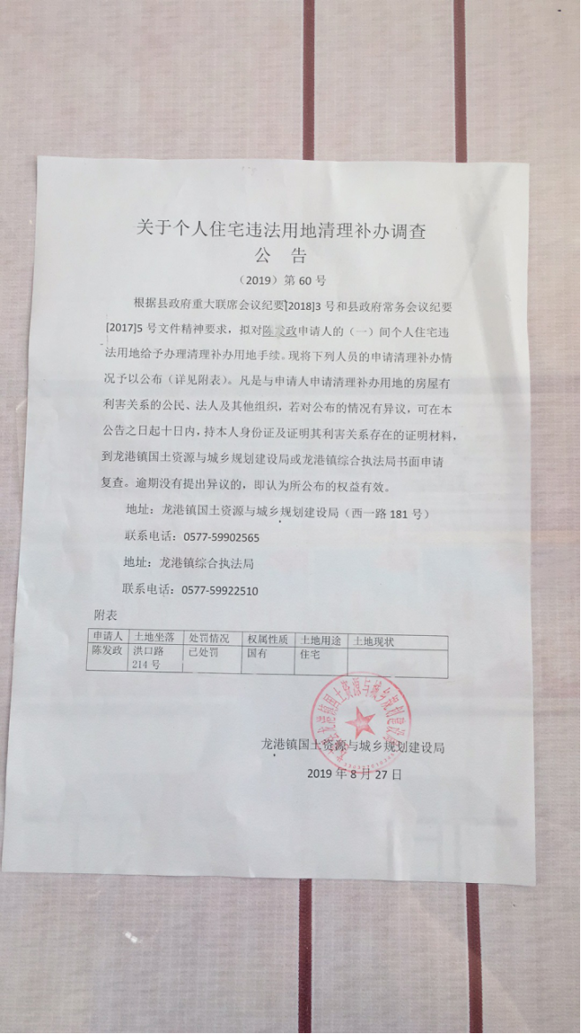 根据县政府重大联席会议纪要[2018]3号和县政府常务会议纪要[2017]5号文件精神要求,拟对陈发政申请人的(一)间个人住宅违法用地给予办理清理补办用地手续。现将下列人员的申请清理补办情况予以公布(详见附表)。凡是与申请人申请清理补办用地的房屋有利害关系的公民、法人及其他组织,若对公布的情况有异议,可在本公告之日起十日内,持本人身份证及证明其利害关系存在的证明材料,到龙港镇国土资源与城乡规划建设局或龙港镇综合执法局书面申请复查。逾期没有提出异议的,即认为所公布的权益有效。
