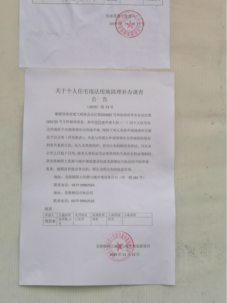 根据县政府重大联席会议纪要[2018]3号和县政府常务会议纪要[2017]5号文件精神要求,拟对周昌奉申请人的(一)间个人住宅违法用地给予办理清理补办用地手续。现将下列人员的申请清理补办情况予以公布(详见附表)。凡是与申请人申请清理补办用地的房屋有利害关系的公民、法人及其他组织,若对公布的情况有异议,可在本公告之日起十日内,持本人身份证及证明其利害关系存在的证明材料,到龙港镇国土资源与城乡规划建设局或龙港镇综合执法局书面申请复查。逾期没有提出异议的,即认为所公布的权益有效。