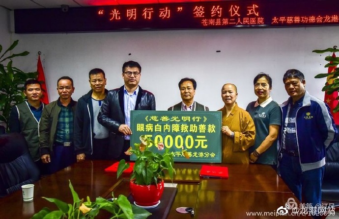 2019年11月25日,太平慈善龙港分会与龙港医院在医院综合楼举行"太平慈善光明行动"善款资助签约仪式。太平慈善龙港分会会长释信道、常务副会长李信,龙港医院院长陈先亲、书记方伟等参加了签约仪式。太平慈善龙港分会为帮助更多白内障患者早日摆脱眼疾带来的困扰重建光明,特联合龙港医院启动第六期慈善光明行动,为60岁以上的孤寡老人、五保户和其他特困家庭患者等优抚对象建立专项资金,资助其手术费用。太平慈善光明行动自2014年启动至今共计资助善款26万元。
