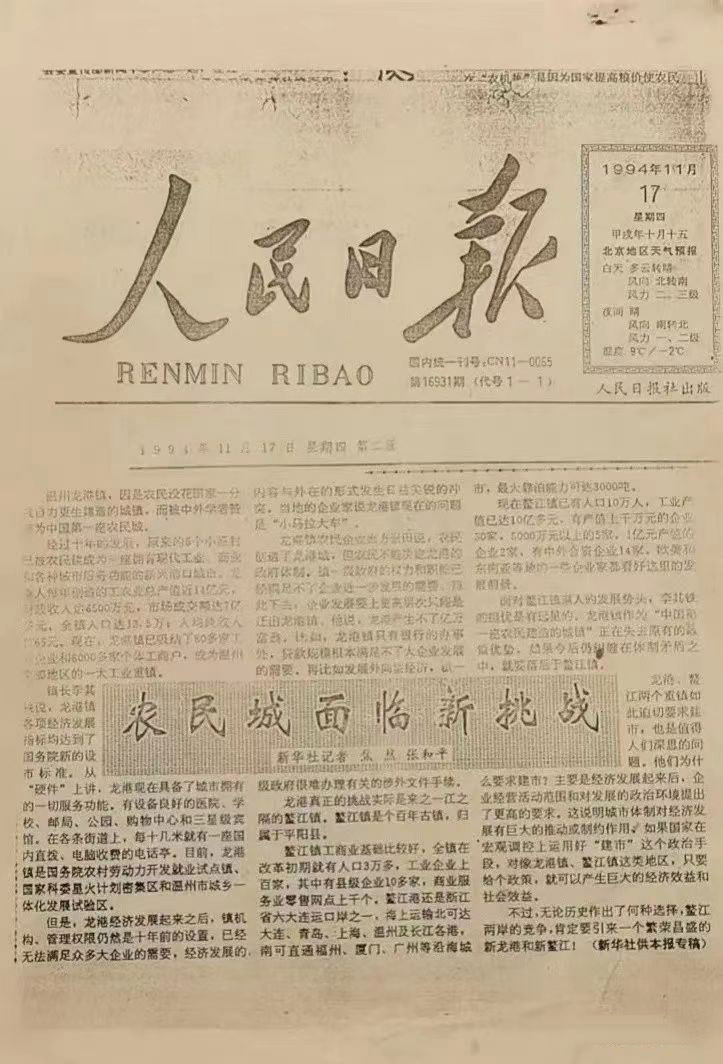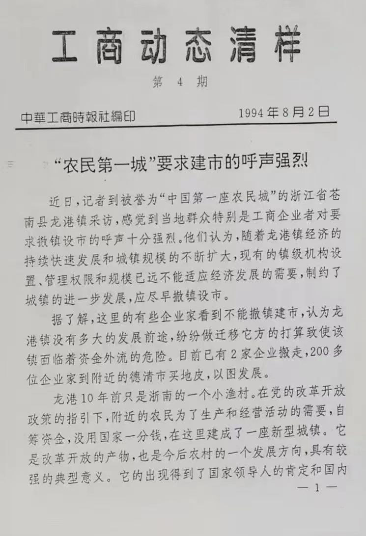 1994年5月15日和8月15日,中央电视台在《新闻联播》栏目中两次播放龙港镇十年的建设成就。1994年10月1日、1995年1月26日、1995年7日10日,张和平连续写了3篇国内动态清样,《文汇报》沈吉庆、《解放日报》傅玉祥在1990年8月写了情况反映,《中华工商时报》张凤山在1994年8月写工商动态清样,都强烈呼吁龙港农民城升格设市。
