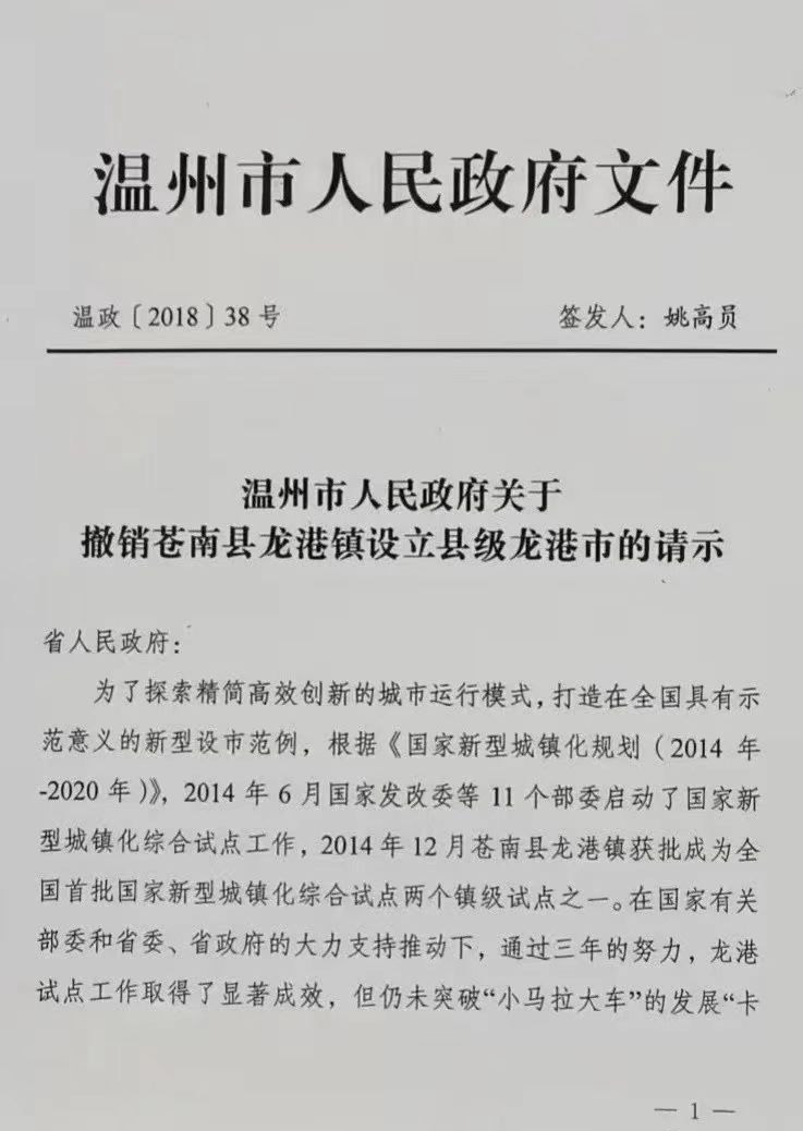 2018年2月,常务副省长带领省发改委、民政厅等相关部门到苍南县、龙港镇就撤镇设市问题进行协调。2018年9月,总理视察浙江期间,省委向总理汇报要求国务院解决浙江7个重大问题中的第二个问题,就是要求尽快批准龙港撤镇设市。2018年6月29日,《温州市人民政府关于撤销苍南县龙港镇设立县级龙港市的请示》上报省政府,2018年9月18日,《浙江省人民政府关于设立县级龙港市的请示》上报国务院。